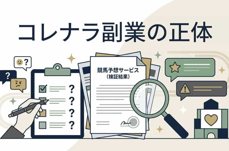コレナラ副業(株式会社コンフォート・岡村拓実)の競馬予想を検証。情報薄く口コミ悪め、ギャンブル依存で安定稼ぎ非推奨。申込前の注意点と代替案を解説。
